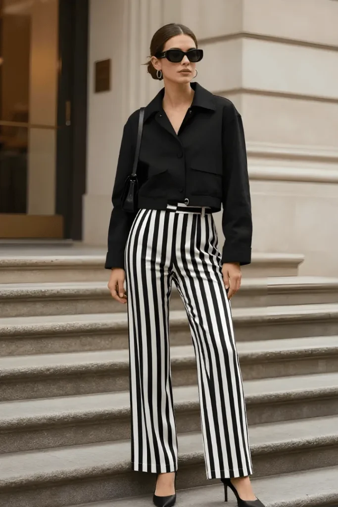 Aesthetic spring work outfits 2026 embrace pattern play with confidence, and these bold vertical stripe trousers paired with a structured black cropped jacket exemplify this trend beautifully. The black and white stripes create visual elongation while adding graphic interest to an otherwise classic combination.