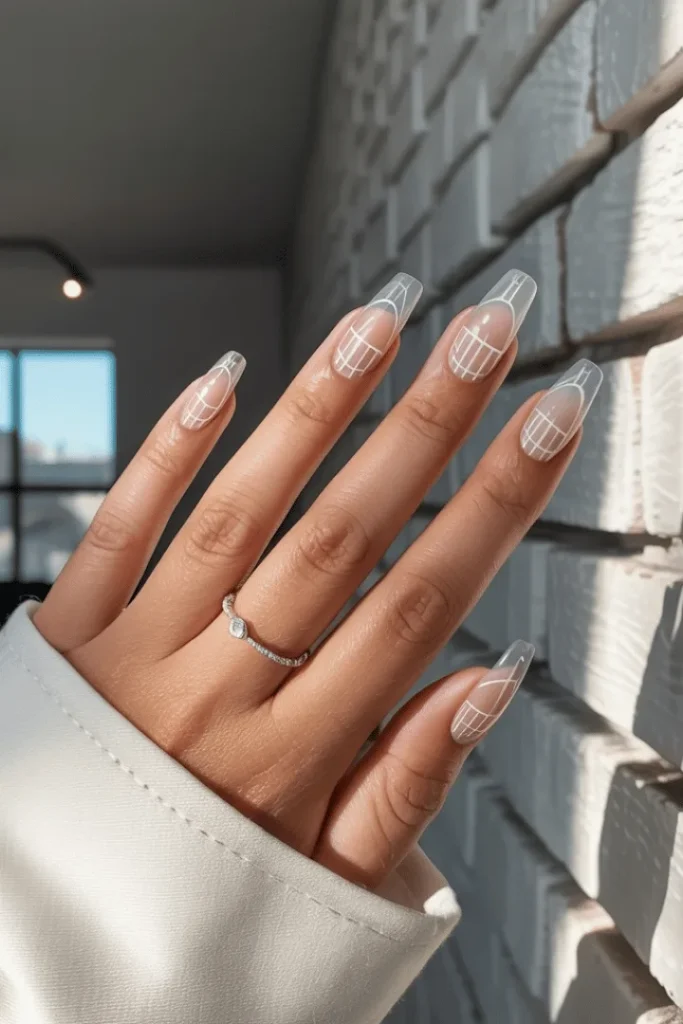 These dreamy nails combine a sheer gray base with delicate white gridlines for a look that’s utterly unique. The barely-there color creates an almost glass-like effect while the geometric patterns add architectural interest. This soft blue ombre snowflake nails adjacent style brings winter sophistication to your fingertips.