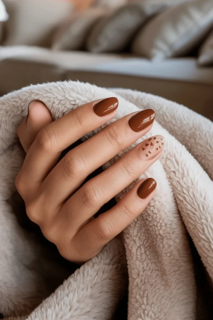The short oval shape keeps things practical while the glossy finish adds sophistication. Brown tones have been gaining major traction in nail trends, and this execution shows why. The leopard accent prevents the look from feeling too plain while maintaining an overall put-together aesthetic.