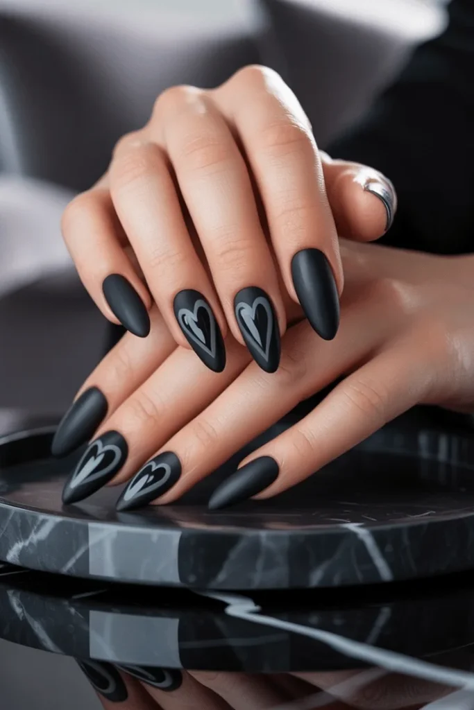 Valentine’s Day goes alternative with these stunning matte black nails featuring gray heart outlines. The sophisticated color combination appeals to those who love romance but prefer darker aesthetics. These heart nail designs february feel moody and mysterious rather than saccharine sweet.
