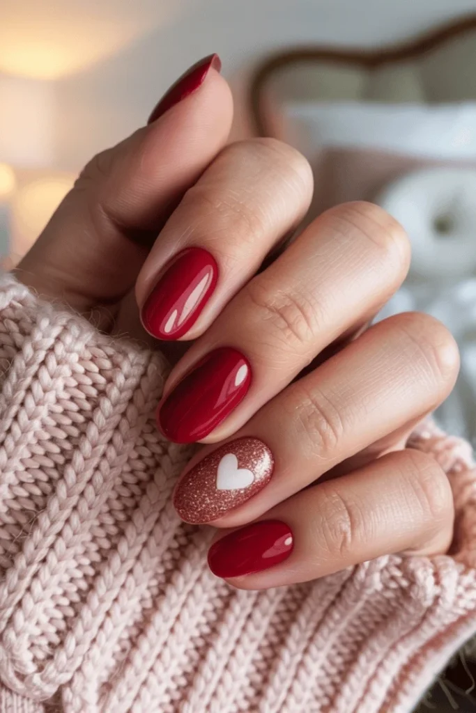 Traditional Valentine’s Day energy radiates from these beautiful deep red nails with a rose gold glitter accent. The white heart detail on the glitter nail ties everything together perfectly. This cute february nails designs valentines day look delivers exactly what the romantic heart desires.