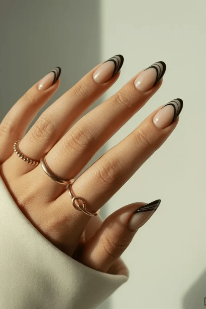 These sleek nails feature a nude base with thin black curved lines at the tips for a minimal yet striking effect. The double-line detail creates more interest than a single stripe while maintaining clean aesthetics. This black and white french nails approach feels editorial and fashion-forward.