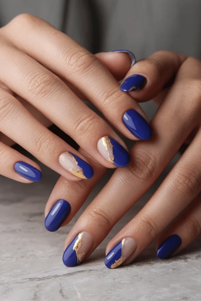 Stunning cobalt blue nails get elevated with delicate gold leaf accents on select fingers. The combination feels regal and luxurious, perfect for those who want their manicure to make a statement. Royal blue almond nails variations of this concept would look equally stunning with the shorter oval shape shown.