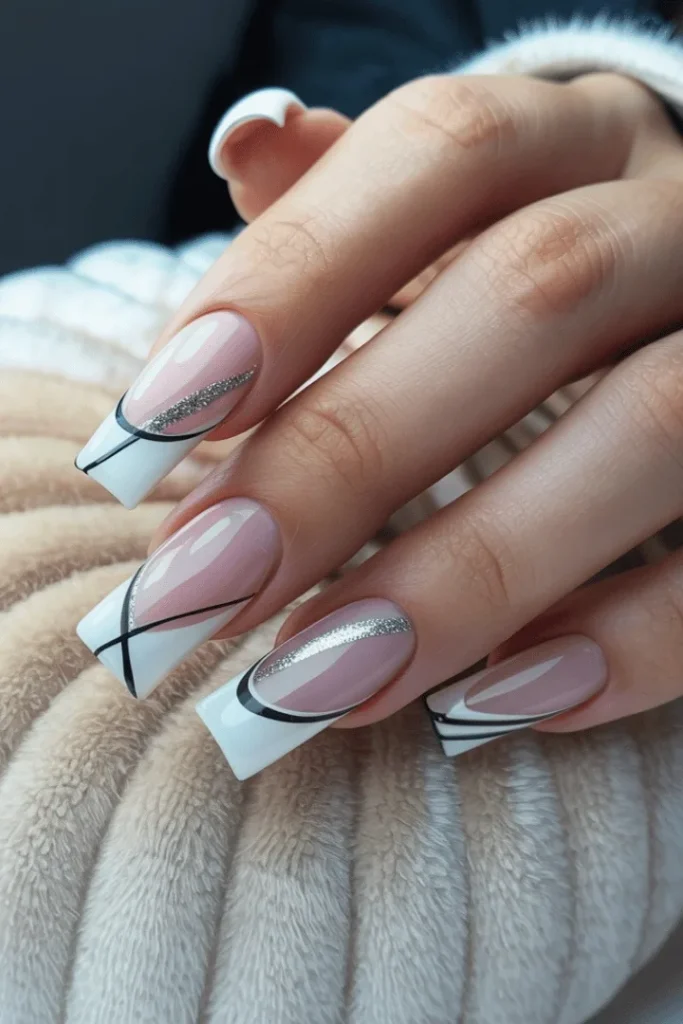 These refined nails combine white french tips with delicate silver glitter lines for understated glamour. The pink-nude base keeps things soft while the geometric silver details add modern edge. This winter to valentines transition nail designs option works for both seasons effortlessly.