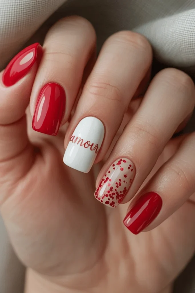 Love literally spells itself out on these adorable Valentine’s nails featuring “amour” text and confetti accents. The combination of glossy red, crisp white, and playful dots creates maximum romantic energy. This valentines day art ideas design leaves no doubt about the occasion.