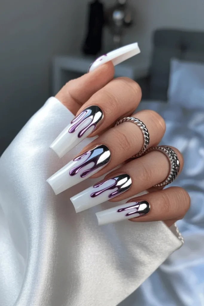 These show-stopping nails feature white coffin shapes with dramatic purple chrome drips that look like liquid metal. The 3D effect creates serious visual impact that’s impossible to ignore. Chrome nails february trends reach new heights with this artistic interpretation.