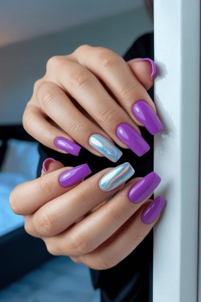 Step outside the traditional Valentine’s color palette with these stunning deep purple winter nails that absolutely pop. The rich violet shade feels luxurious and unexpected, perfect for those who want their manicure to stand out. The holographic accent nail adds a futuristic touch that elevates the entire look.