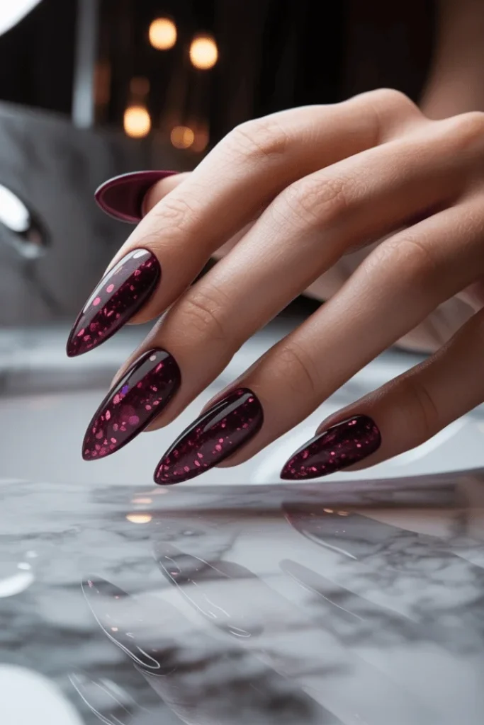 Rich plum nails embedded with fine glitter particles create an almost galaxy-like effect that’s absolutely mesmerizing. The deep purple shade feels mysterious and luxurious while the sparkle adds festive energy. These almond nails february designs prove that sometimes one gorgeous color is all you need.