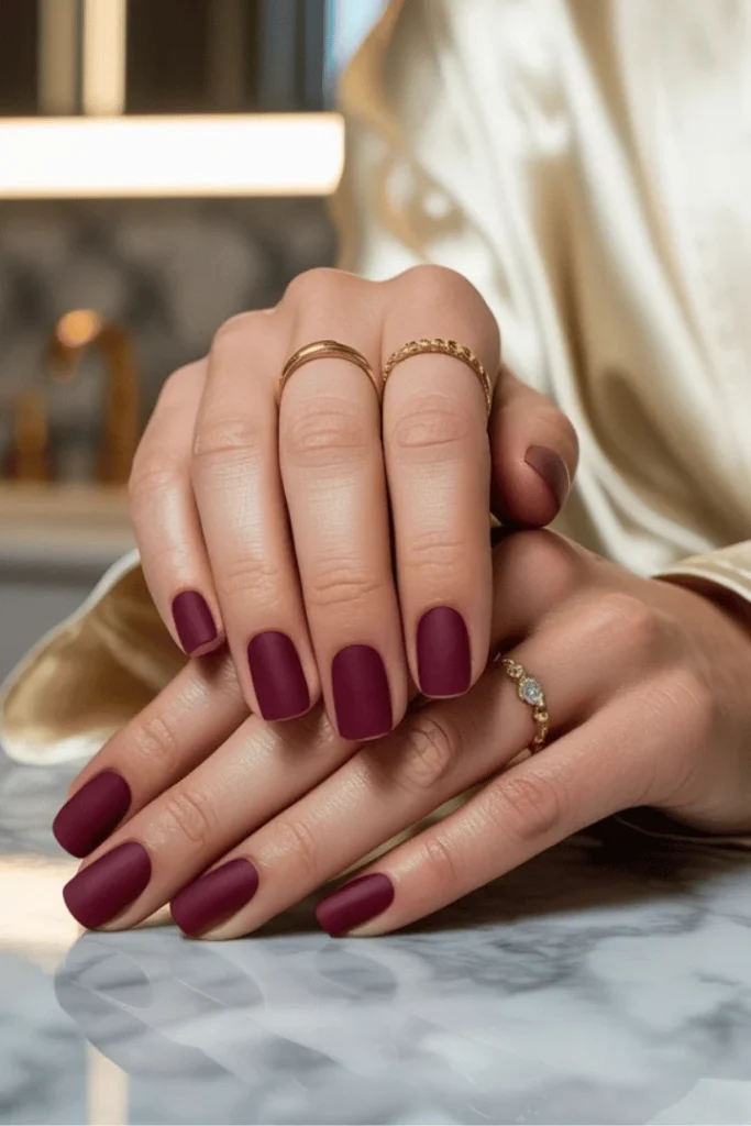 These nails designs for short nails february demonstrate how powerful the right color and finish combination can be. The matte topcoat transforms a simple burgundy into something special, catching light differently and creating an almost suede-like appearance. This look pairs beautifully with gold jewelry, as shown with the delicate rings in the image.