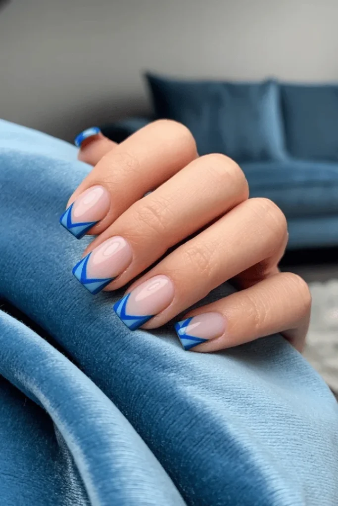 Blue winter nails get a geometric upgrade with these stunning chevron french tips. The nude base keeps things clean and elongating while the dual-tone blue tips create visual interest. This modern take on the classic french manicure feels fresh and contemporary for 2026.