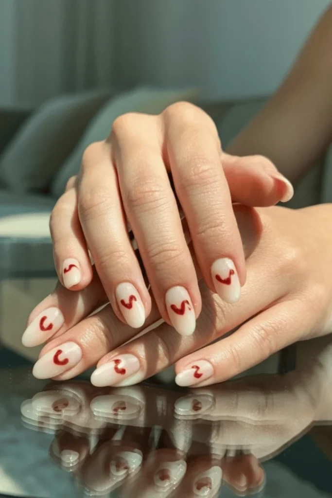 Less is definitely more with these delicate cream nails featuring abstract red swooshes. Each nail showcases a single, organic curve in cherry red that looks almost like a brushstroke from a watercolor painting. This minimalist winter nail designs approach proves that valentine nail designs can be subtle yet stunning.