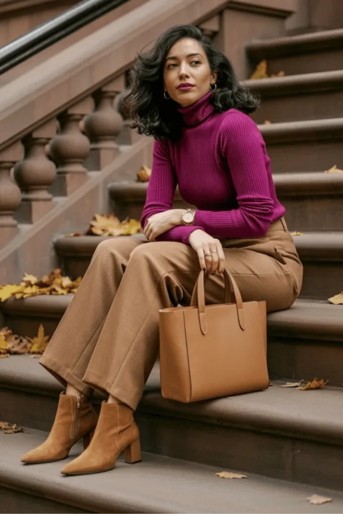 The vibrant magenta turtleneck paired with camel-colored wide-leg trousers creates an unexpected color combination that feels both bold and refined. This look demonstrates sophisticated color blocking—choosing rich, saturated tones that complement rather than clash. The tan leather tote and suede ankle boots in matching camel tones ground the outfit, while gold jewelry adds subtle warmth.