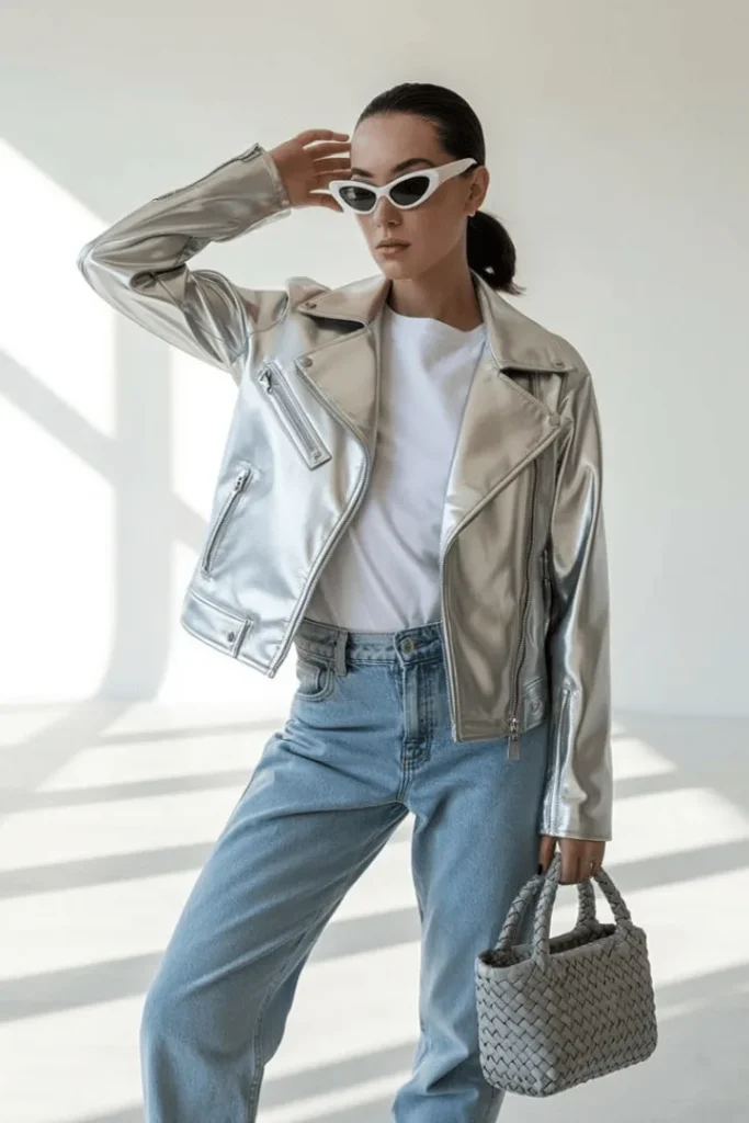 The metallic silver jacket outfit instantly transforms the most basic pieces into something extraordinary. This look pairs a liquid-shine moto jacket with a crisp white tee and light-wash wide leg jeans, creating that perfect balance between edge and ease. The sculptural cat-eye sunglasses and woven handbag add just enough personality without competing with the statement outerwear.