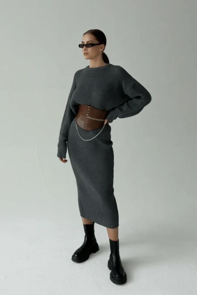 The matching sweater and jeans winter outfit gets a sophisticated upgrade with this ribbed knit coordinate set. The charcoal gray ensemble—featuring a relaxed pullover and midi pencil skirt—creates an elegant column of color that’s both comfortable and refined. The brown leather belt bag and chain detail add hardware interest without overwhelming the streamlined silhouette, while the chunky platform boots ground the look with just the right amount of edge.