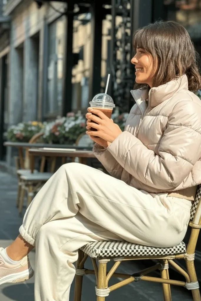 The long cream coat winter outfit takes on a more casual interpretation with this quilted puffer jacket styled as a complete set. The tonal dressing—from the beige jacket to the off-white joggers and cream sneakers—creates a sophisticated monochrome look that feels luxurious despite its sporty origins. The checkered café chair and takeaway coffee complete this quintessentially Parisian winter scene.