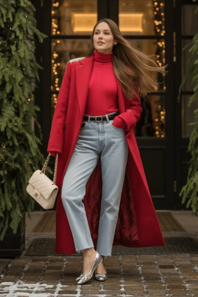 The red coat winter outfit february is a timeless choice that never fails to make an impact. This floor-length crimson coat draped over a matching turtleneck creates a monochrome red outfit february that’s bold without being overwhelming. Light-wash jeans and metallic pumps provide the perfect neutral counterpoints, letting the red take center stage while keeping the overall look balanced.