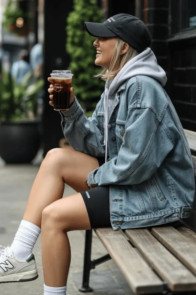 The oversized denim jacket layered over a gray hoodie with black bike shorts creates the epitome of casual winter street style. This look embraces the high-low mixing trend—combining athletic pieces with classic denim for an outfit that’s comfortable, practical, and surprisingly stylish. The white tube socks with gray New Balance sneakers add that perfect touch of throwback athletic aesthetic.