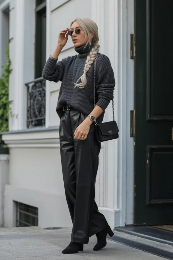 The monochrome winter outfits trend reaches its zenith with this dark and moody combination. An oversized charcoal turtleneck sweater meets wide-leg black leather trousers, creating drama through silhouette rather than color. The braided platinum hair and round sunglasses add editorial polish, while the small structured handbag keeps things practical.