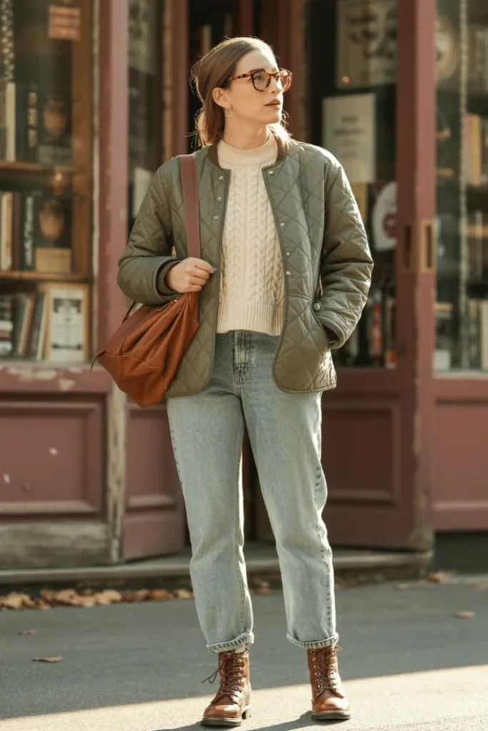 The quilted field jacket in olive green paired with a cream cable-knit sweater creates that perfect casual winter street style moment. This look balances practical outerwear with cozy underlayers, creating a combination that’s both functional and aesthetically pleasing. The light-wash vintage jeans and brown leather boots complete the outfit with classic Americana vibes, while the cognac tote bag provides practical carrying capacity.