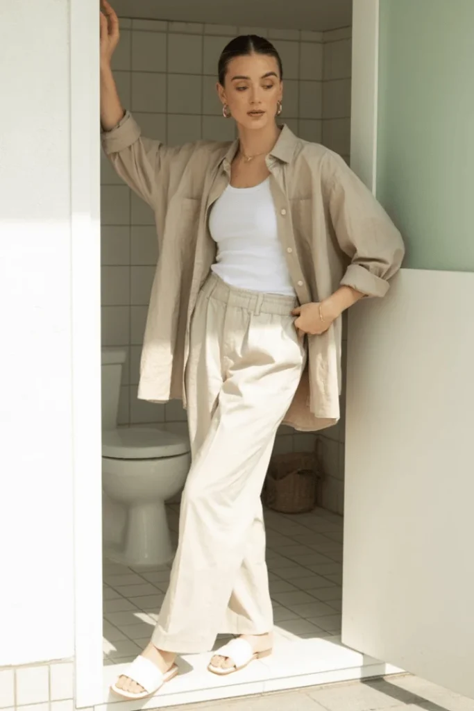 The oversized linen shirt worn open over a white tank with flowing cream trousers creates an unexpectedly fresh winter look. This combination challenges the assumption that February requires heavy knits and dark colors, instead offering a lighter, more breathing approach to cold-weather dressing. The slide sandals keep things casual and comfortable, perfect for climates where winter means mild rather than freezing.