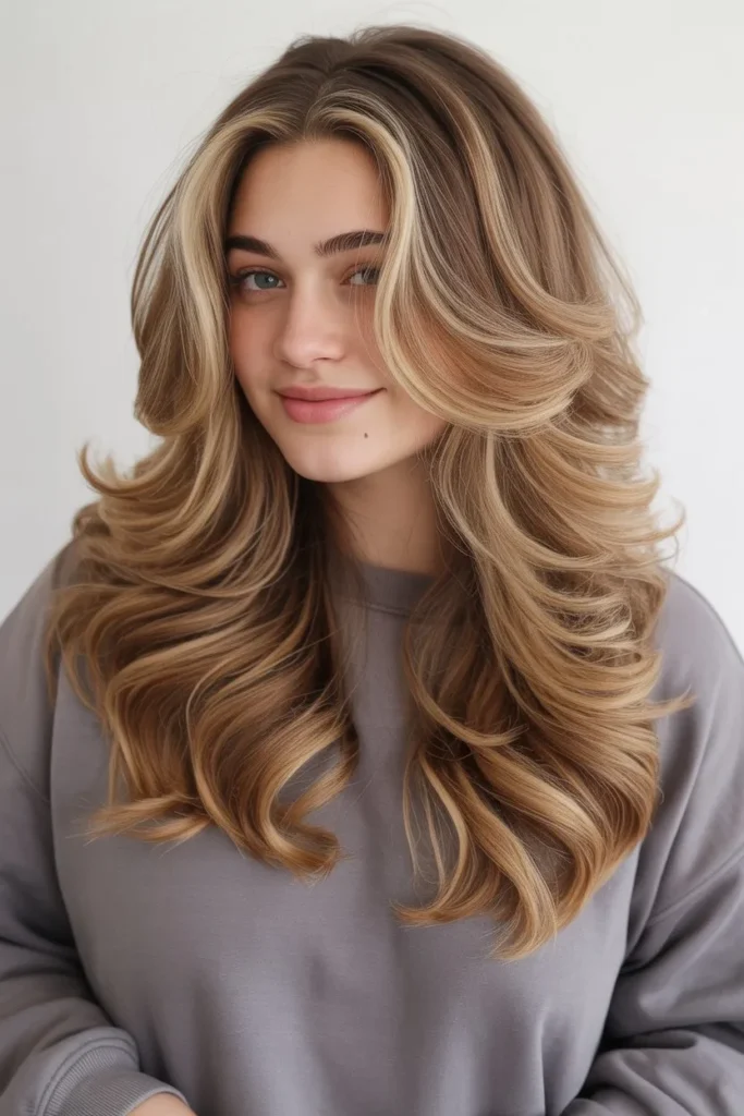 Long, layered hair with curtain bangs is having a major moment, and it’s easy to see why this style is so universally flattering. The combination of lengthy, flowing waves with face-framing curtain bangs creates a beautifully balanced look that’s both romantic and modern. The warm bronde color—a perfect blend of brown and blonde tones—adds richness and dimension that complements various skin tones beautifully.