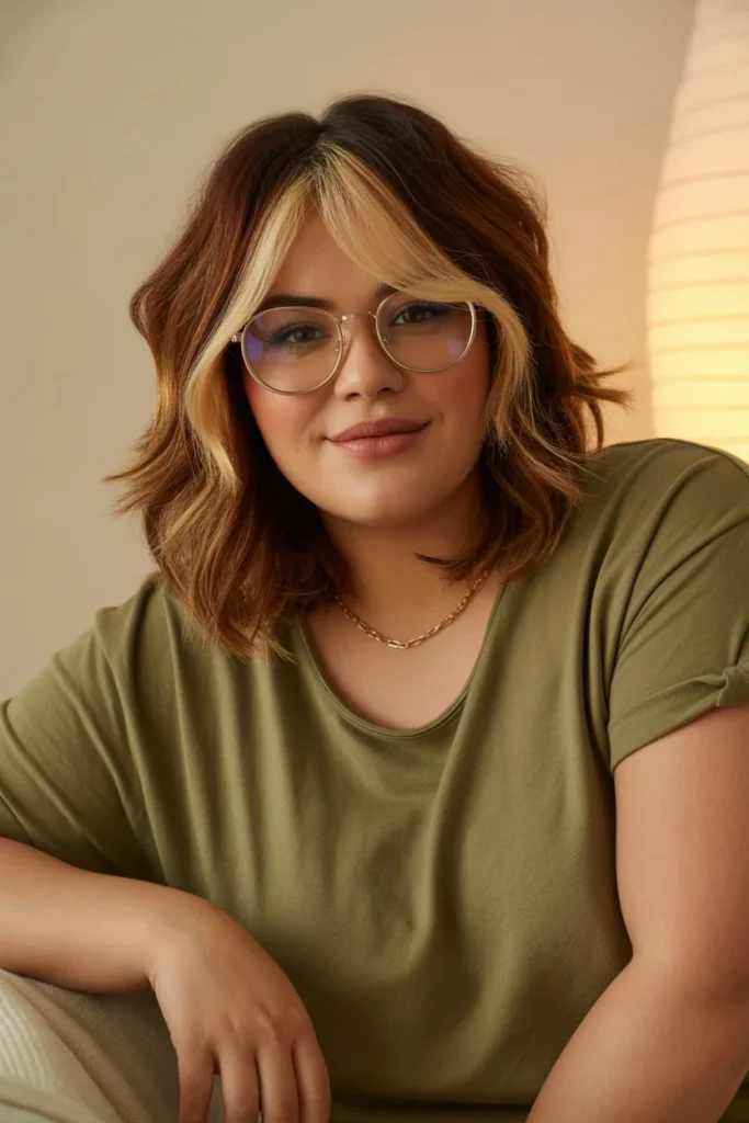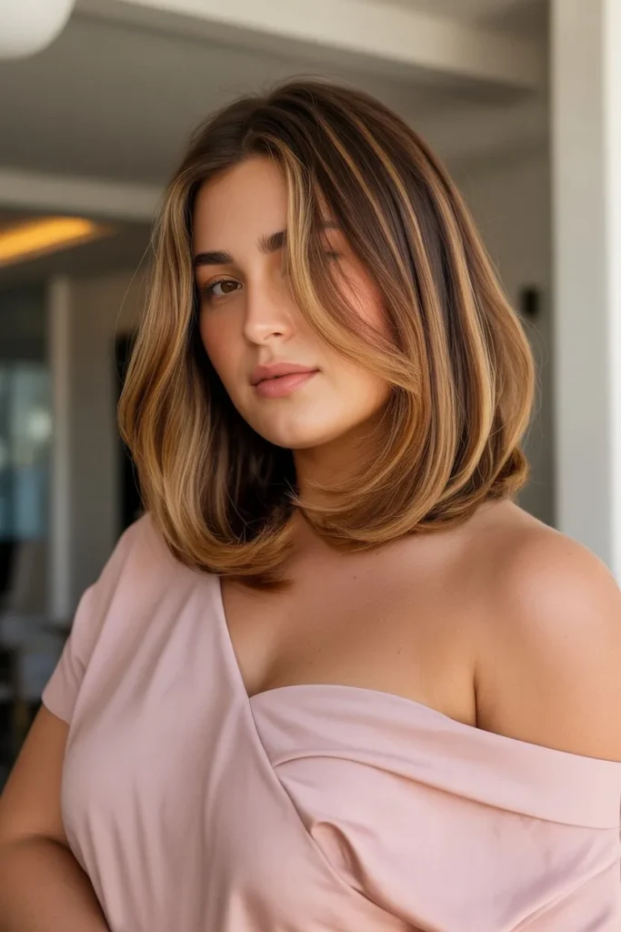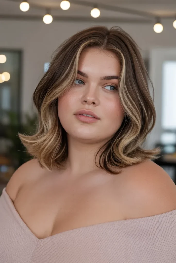 The shoulder-length bob has made a major comeback, and for good reason. This sophisticated cut hits right at the collarbone, creating a flattering length that balances proportions beautifully for plus size women. The gorgeous balayage technique adds warmth with honey-blonde highlights that blend seamlessly with darker roots, creating a sun-kissed effect that’s both natural and eye-catching.