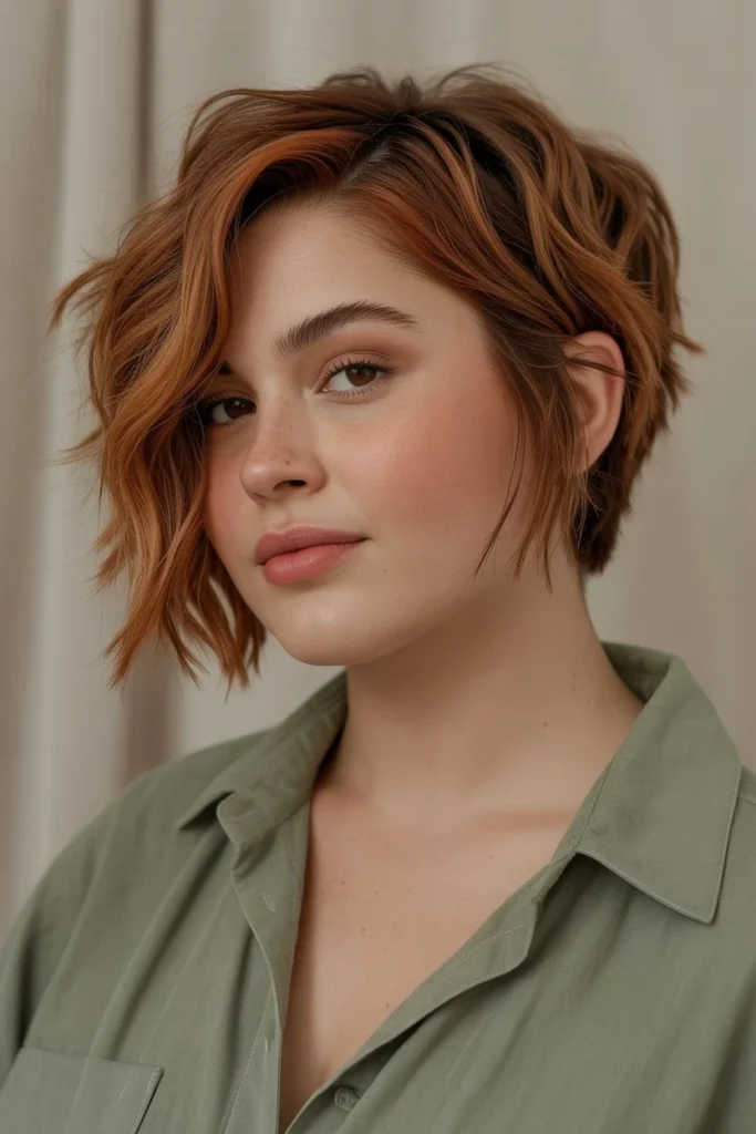 Who says plus size women can’t rock short hair? This stunning textured pixie proves that bold, short cuts can be incredibly flattering and fashion-forward. The warm auburn color with caramel highlights adds richness and dimension, while the piecy, textured styling creates movement and interest throughout. The slightly longer top allows for versatile styling options, while the shorter sides keep the look clean and contemporary.