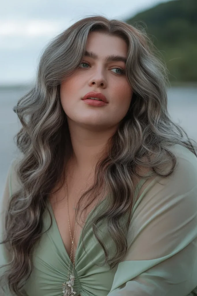 There’s something absolutely enchanting about long, flowing waves that cascade past the shoulders with effortless grace. This romantic style features beautifully blended ash-brown tones with subtle silver-gray highlights that add incredible dimension and depth. The soft, loose waves create movement and volume while the length elongates the overall silhouette, drawing the eye vertically rather than horizontally.