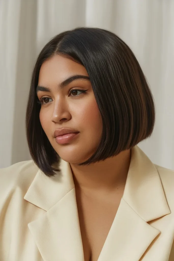 What makes this blunt cut particularly effective for plus size women is how it creates strong, confident lines that command attention. The weight of the hair sits at the most flattering point on the neck and shoulders, creating beautiful proportions that balance the overall silhouette. The sleek, straight styling elongates the appearance of the neck and draws attention to the face, while the center part creates symmetry that’s universally flattering.