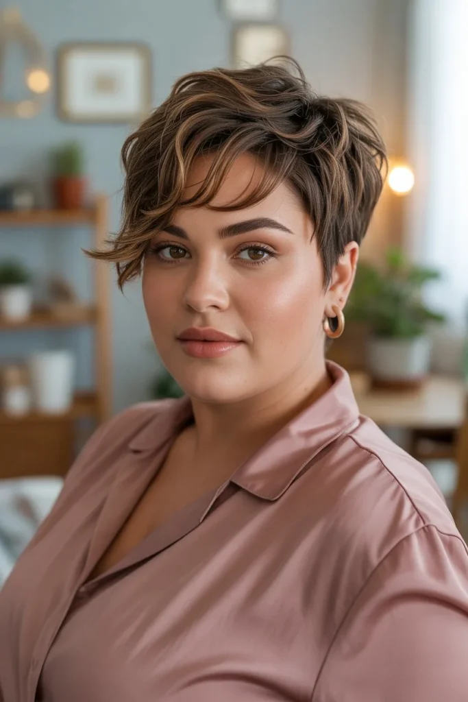 What makes this pixie cut particularly effective for plus size women is how it draws all attention to the face, creating a striking focal point that’s utterly captivating. The textured styling adds volume at the crown, which helps balance proportions and create elegant lines. The longer pieces at the front can be styled forward or swept to the side, offering versatility and the ability to customize the look. The shorter sides keep the style clean and contemporary while highlighting beautiful facial features.