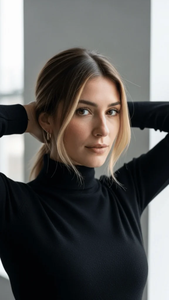 And honestly, this style represents freedom to me. Freedom from high-maintenance routines, freedom from rigid styling requirements, freedom to let hair be beautifully imperfect. The black turtleneck in this image creates stunning contrast that elevates the blonde’s warmth.