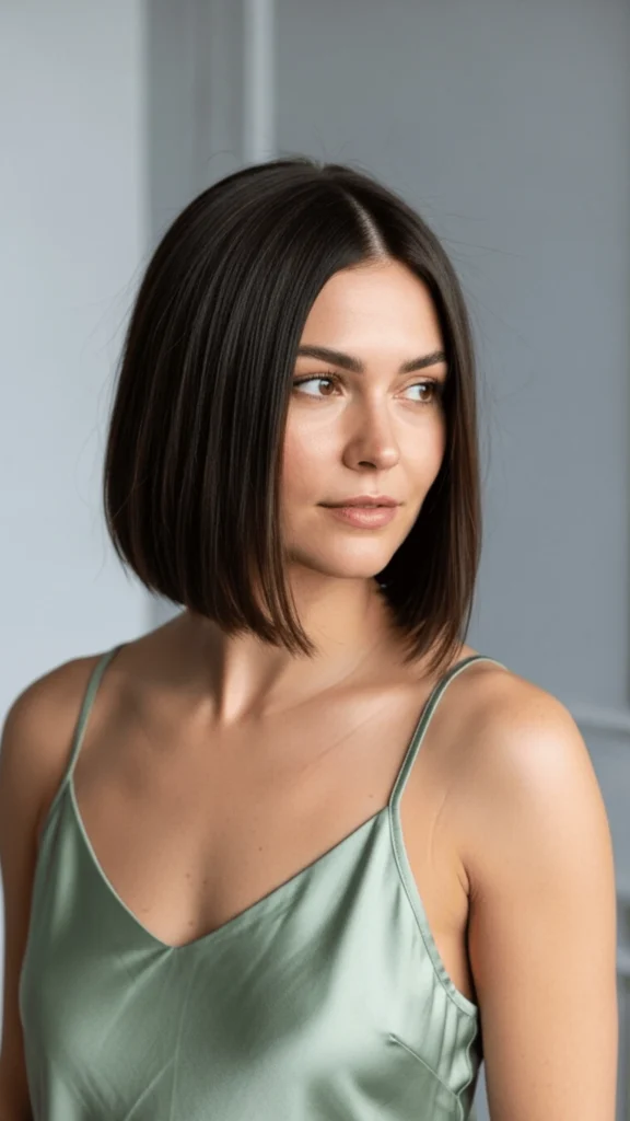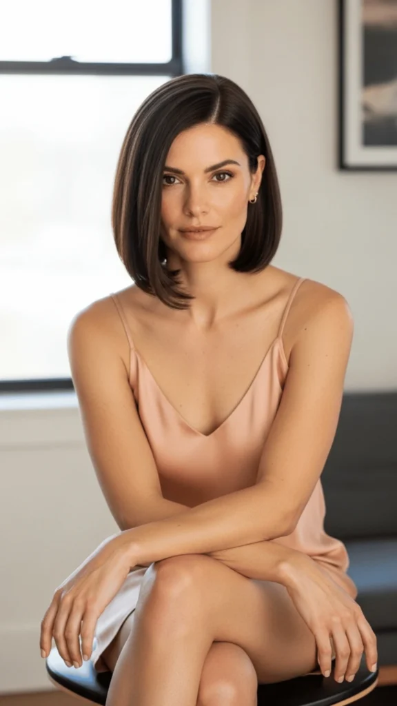 This bob radiates confidence without demanding attention—it earns respect through quiet excellence. The blush silk dress in this image demonstrates how dark hair creates stunning contrast with softer color palettes, proving versatility across aesthetics.