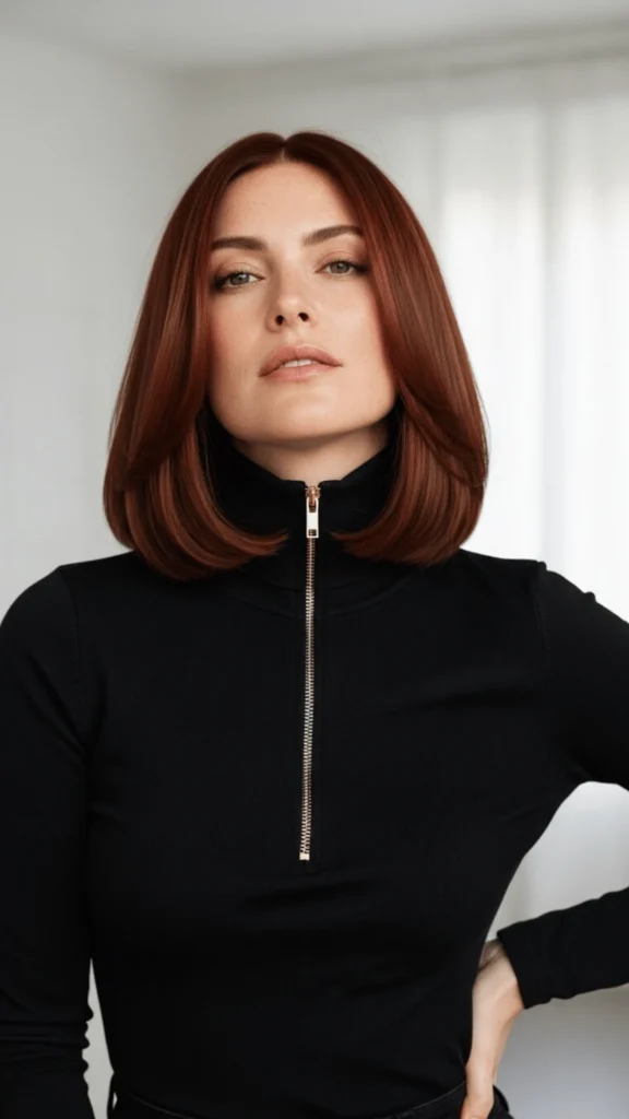 Auburn continues to dominate spring color conversations, and this sleek rendition demonstrates why the shade deserves its prominence. The cut features a precise lob that falls just past the chin with ends that curve slightly inward. The auburn color sits richly in the chestnut family with subtle red undertones that emerge in sunlight. As a spring haircut for round faces 2026, this style works exceptionally well because the length creates elongation while the color’s warmth brings vitality to the complexion.