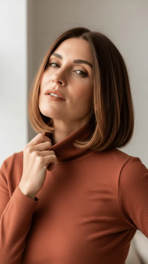 This lob demonstrates how a well-executed cut and carefully chosen color can create something greater than the sum of its parts. The terracotta turtleneck in this image perfectly complements the hair’s warmth, showing thoughtful coordination between hair and wardrobe.