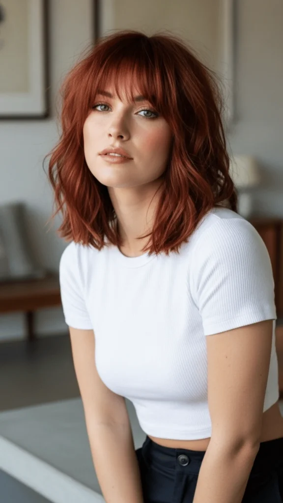 If there’s one thing I’ve learned about spring transformations, it’s that sometimes the boldest choice is the most liberating. This vibrant copper shade with textured, curtain-adjacent bangs makes an undeniable statement. The color sits firmly in true copper territory—not subtle auburn, not strawberry blonde, but genuine copper that glows. Combined with shoulder-length waves and those effortlessly tousled bangs, this spring haircut short in the front, longer through the lengths creates dimension and interest from every angle.