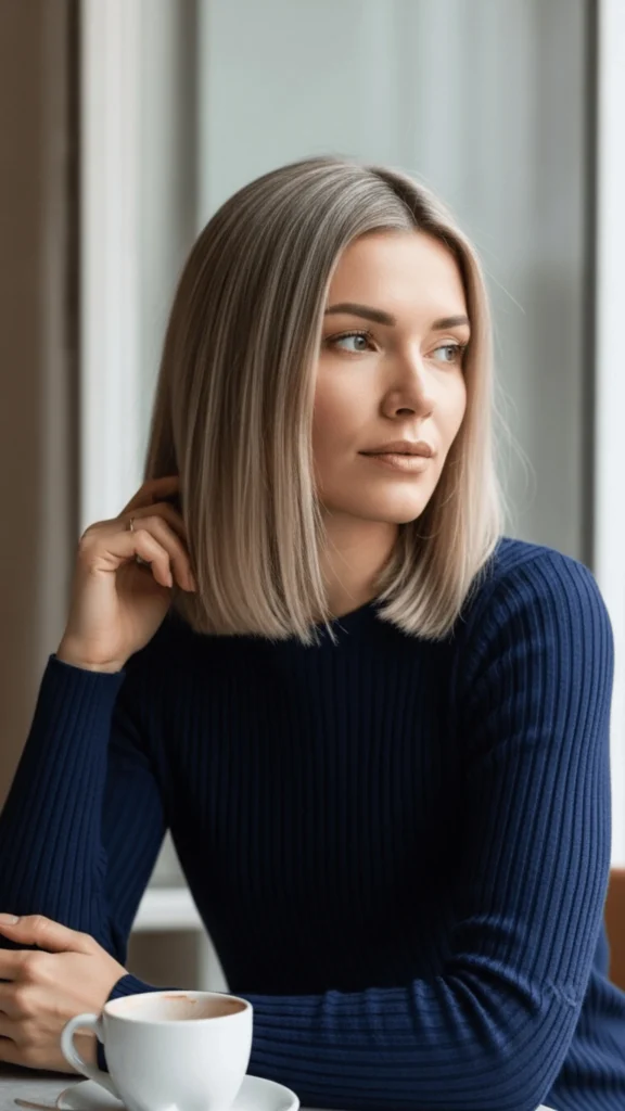 This bob proves that sleekness never truly goes out of style; it simply evolves with technique and color innovation. Against the navy sweater in this image, the cool blonde creates a striking contrast that feels inherently editorial.