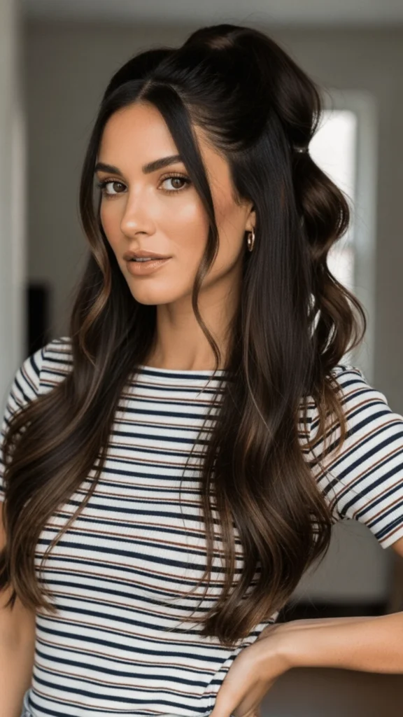 There’s something undeniably romantic about long, cascading waves pulled partially back, and this style captures that dreamy quality perfectly. The rich espresso brown color provides depth while the half-up styling creates visual interest and showcases the hair’s length and volume. As a spring haircut for long hair 2026, this demonstrates how styling can transform a simple cut into something special for occasions or everyday elegance.