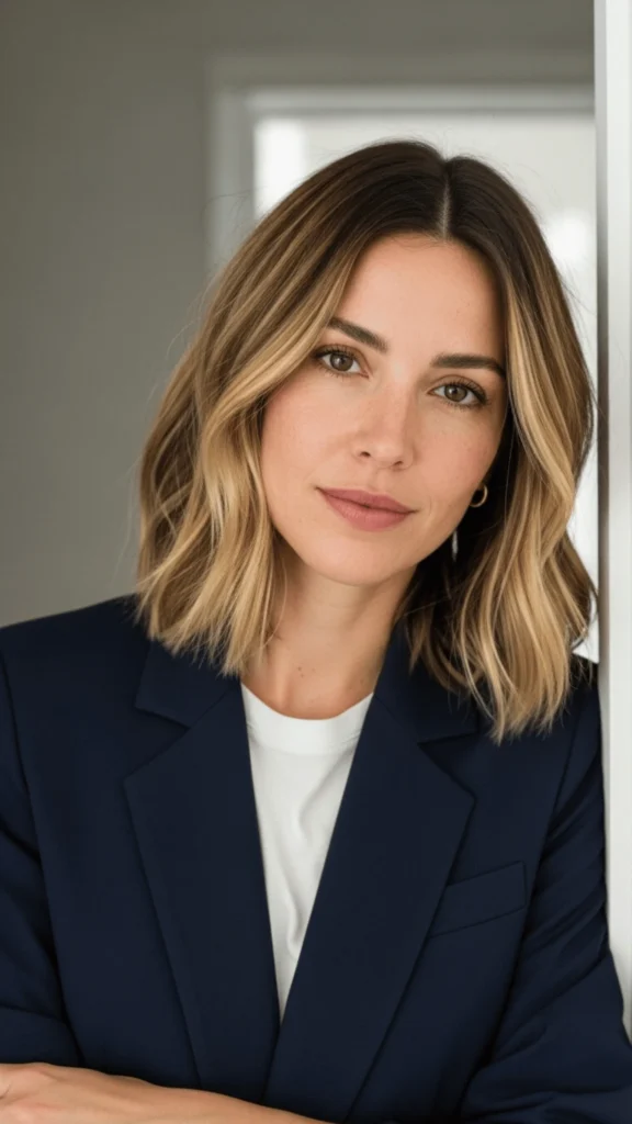 Professional doesn’t have to mean boring, and these effortless blonde waves styled with a navy blazer prove that point decisively. The cut falls just past the shoulders with layers that create movement without chaos. The blonde features darker roots that transition into sun-kissed mid-lengths and ends—low maintenance yet deliberately beautiful. This medium hair idea for 2026 captures what I think of as boardroom-to-beach versatility.