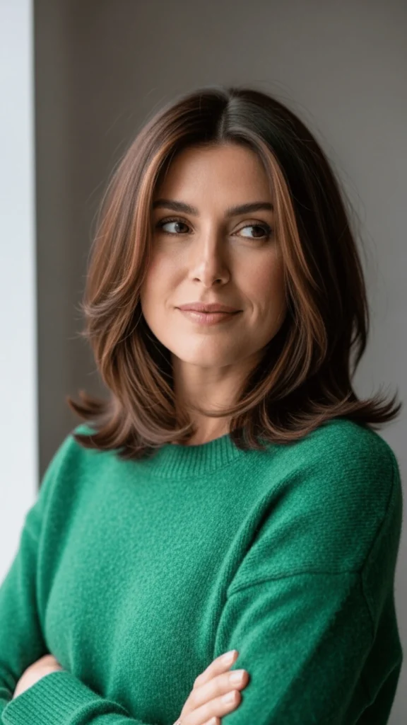 And honestly, this bob represents the best of both worlds: structured enough to look intentional, textured enough to feel effortless. The emerald green sweater in this image shows how this hair color palette works beautifully with spring’s jewel-toned trend.
