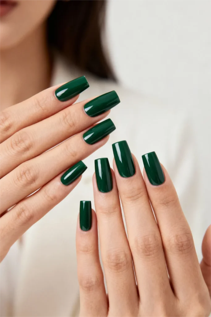 Glossy emerald nails have this incredible depth to them. They’re not flat or one-dimensional. The shine adds layers, making the color look richer and more complex. It catches the light beautifully, so your hands always look polished and intentional, even if you’re just reaching for your coffee or scrolling on your phone. It’s the kind of manicure that makes you feel a little more dressed up, a little more glamorous, even if you’re wearing jeans and a t-shirt.