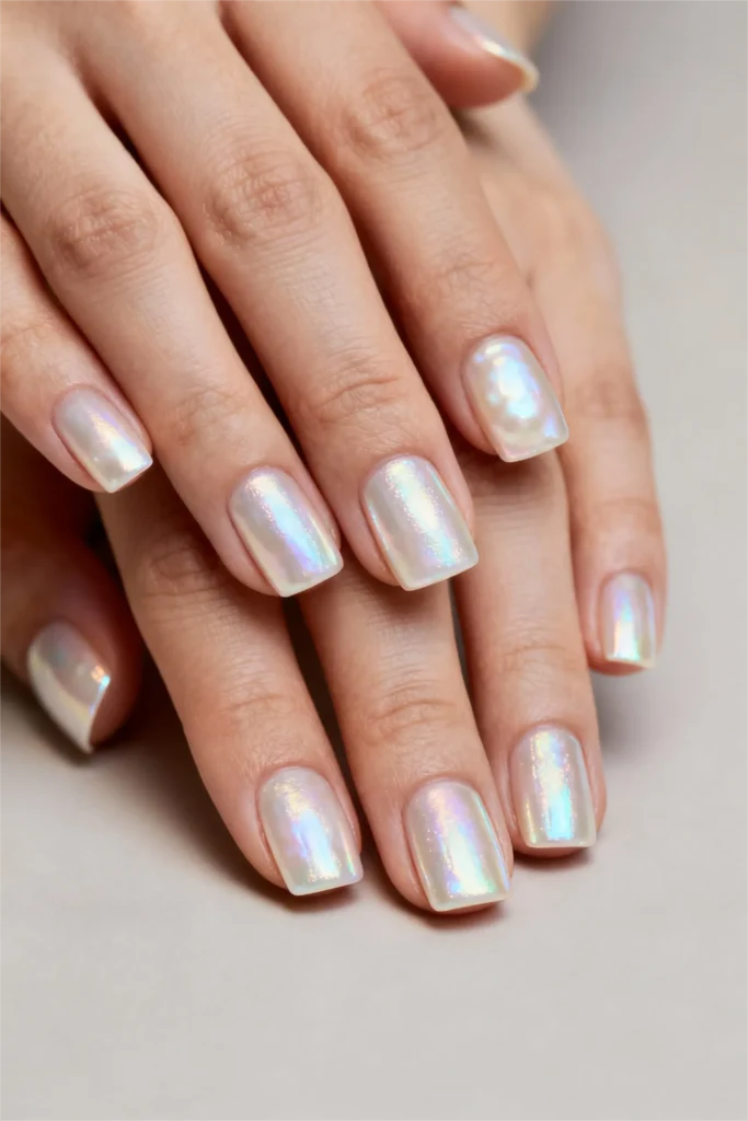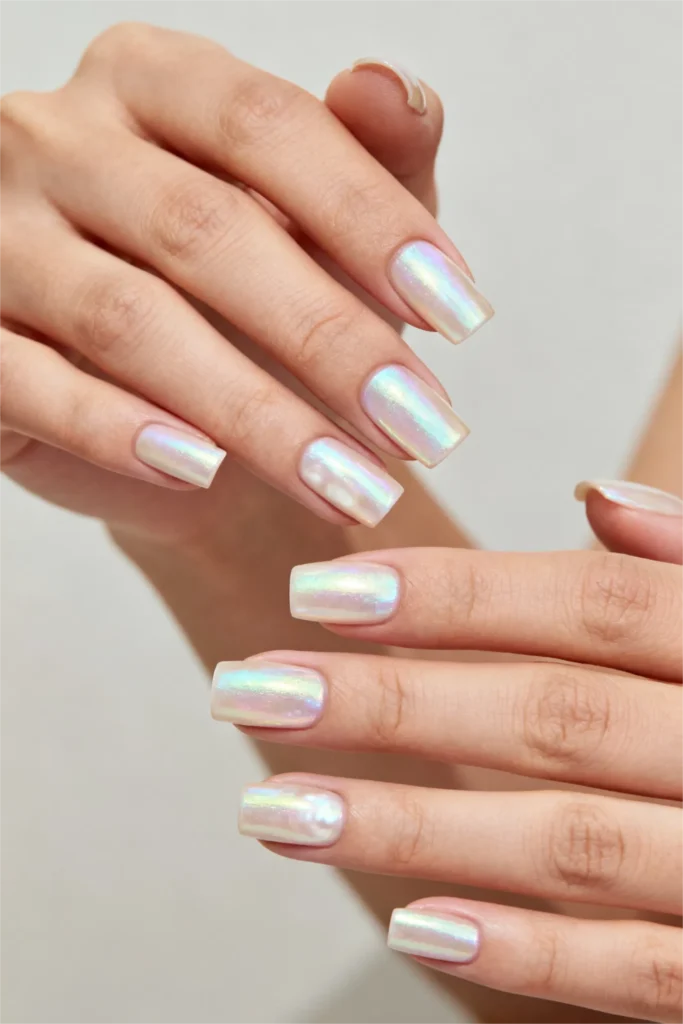 There’s something ethereal about a pearlescent white. It’s not quite opaque, not quite sheer. It has this almost translucent quality that makes your nails look like they’re glowing from within. The shimmer is subtle—just a hint of iridescence that shifts between pink, blue, and silver depending on the angle and the light. It’s soft, dreamy, and impossibly pretty.