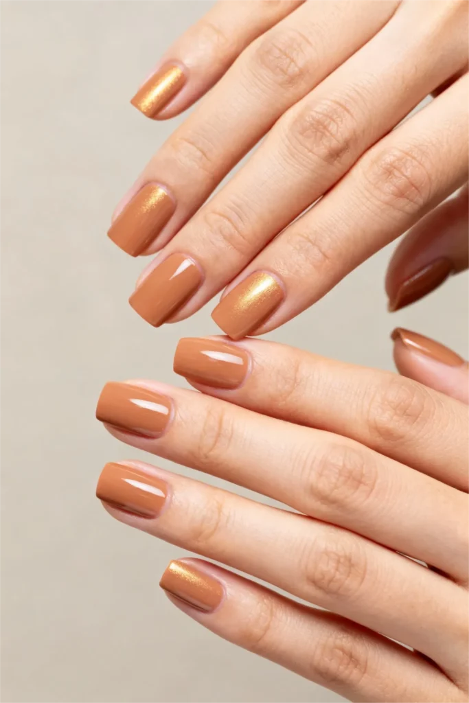 The square shape keeps this from feeling too soft or overly feminine. It adds a modern, structured edge that balances out the warmth and shimmer. This is a great choice if you want something that feels a little more special than a standard nude, but you’re not quite ready to commit to full-on chrome or holographic nails. It’s the perfect middle ground.
