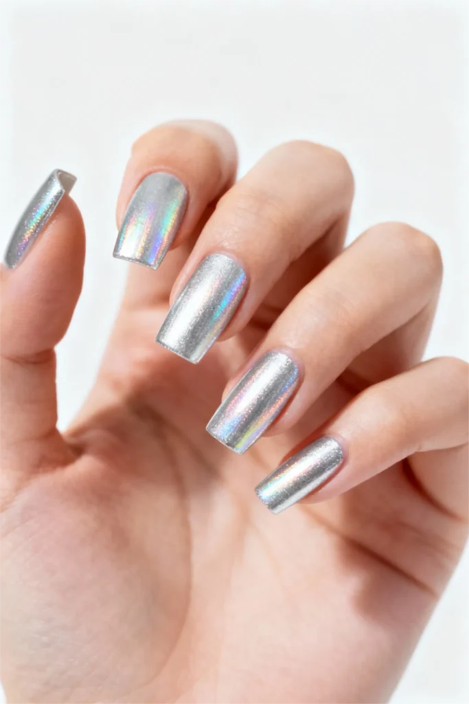 What makes this look so fun is how playful it is. Silver chrome on its own is already bold, but the holographic effect takes it to another level. It’s eye-catching without being gaudy. Fun without feeling juvenile. And because the base is silver rather than gold or rose gold, it has this cool, modern vibe that pairs really well with minimalist jewelry, monochrome outfits, and sleek, contemporary aesthetics.