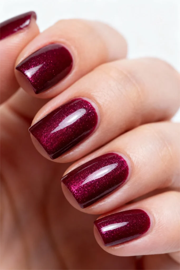 Wine-colored nails are classic, but add a touch of shimmer and they become something more. This deep, rich shade sits somewhere between burgundy and plum, with just enough red to keep it warm and inviting. The shimmer is subtle—not chunky glitter, just a soft, fine sparkle that catches the light when you move your hands. It’s elegant, sophisticated, and feels expensive in the best way.