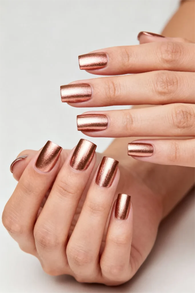 Rose gold is warm, feminine, and endlessly pretty. It’s the perfect middle ground between gold and pink, and it has this soft, romantic quality that makes it feel special without being too flashy. In a metallic or chrome finish, it takes on this gorgeous reflective quality that catches the light beautifully. It’s elegant, modern, and just a little bit glamorous.