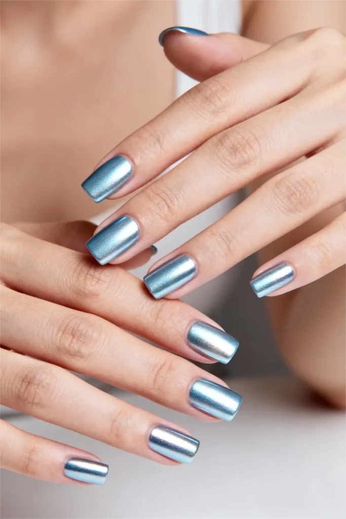 What makes this shade so fun is how it changes depending on the lighting. Indoors, it reads as a soft, frosty blue with subtle silver undertones. Step outside or under bright light, and suddenly it’s glowing, shifting, almost iridescent. It’s one of those finishes that photographs beautifully, which is probably why it’s all over Pinterest and Instagram right now. If you’re someone who likes your nails to be a little bit of a conversation starter, this is it.