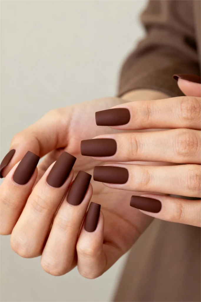 Matte finishes have this velvety, almost suede-like texture that makes your nails look intentional and styled. And chocolate brown, in particular, just looks so rich in matte. It’s the kind of shade that pairs beautifully with gold jewelry, chunky knits, camel coats, and denim. It feels autumnal, yes, but it’s also one of those colors that can work year-round if you style it right. It’s versatile, wearable, and surprisingly sophisticated.
