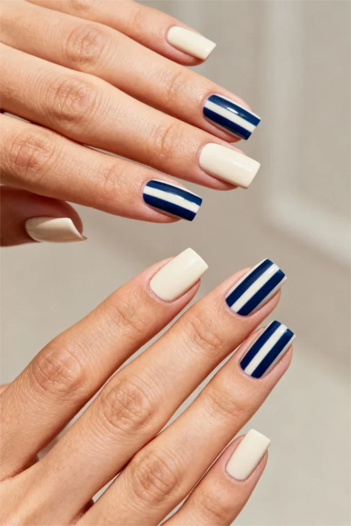 What I love about this look is how it mixes solid colors with pattern. It keeps things interesting without being too busy or overwhelming. Your eyes have a place to rest (the solid nails) while still having something to look at (the stripes). It’s balanced, intentional, and really well thought out. And because the colors are so classic, it works for a ton of different occasions and outfits.