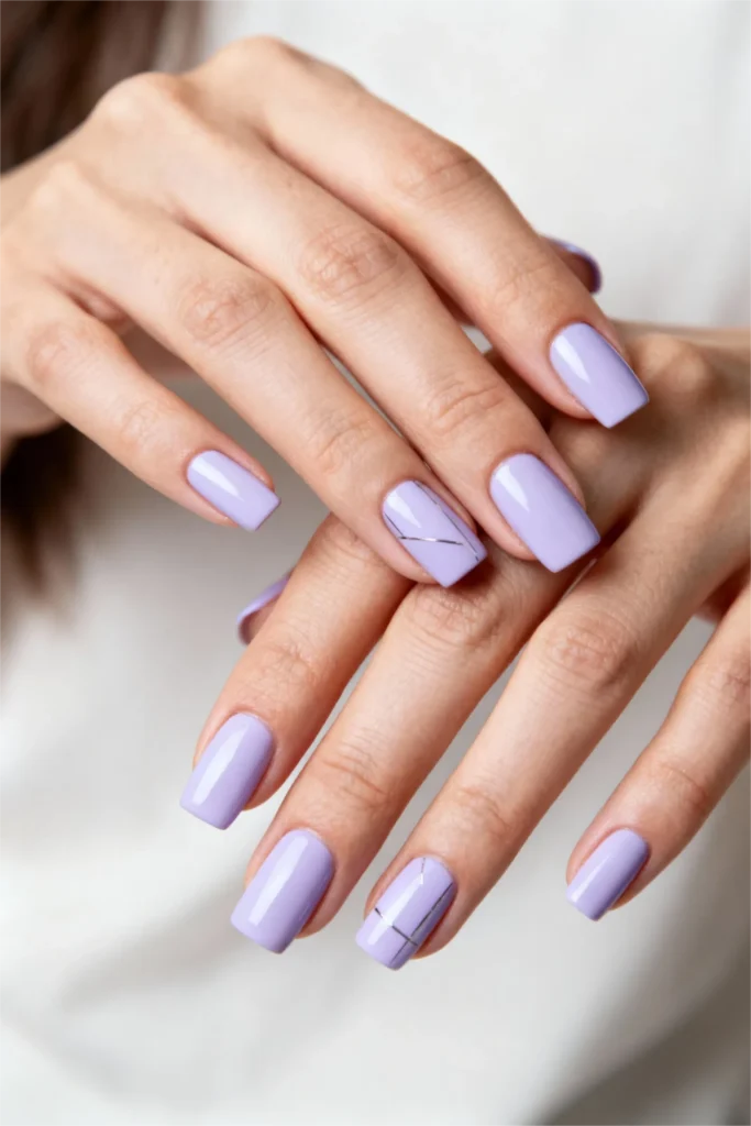Lavender is having a resurgence, and honestly? It’s about time. This shade is soft, calming, and just a little bit nostalgic. It feels like springtime, but in a way that’s not overly sweet or juvenile. When you add a thin black geometric line to one or two accent nails, suddenly the whole look gets a little more interesting. A little more artistic. It’s still minimal, but now there’s intention behind it.