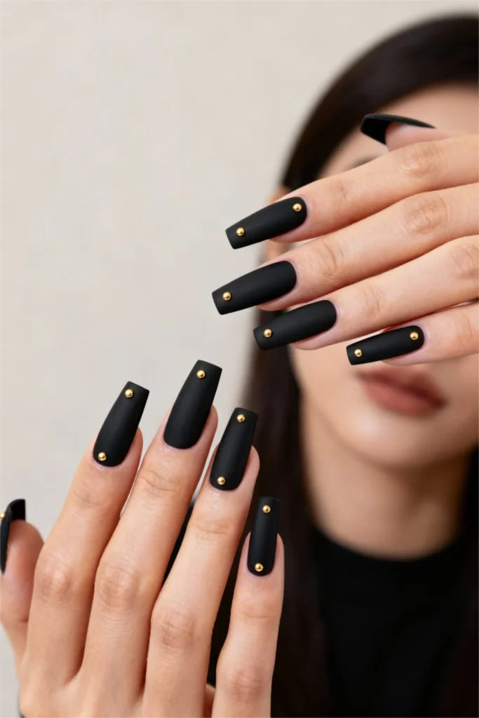 Matte black nails are a classic for a reason. They’re sleek, moody, and endlessly chic. But add a single gold stud to each nail? Now you’ve got something special. This design is all about restraint. It’s not trying to do too much. Just one small metallic accent placed near the cuticle, centered and intentional. That tiny bit of shine against the flat black creates this really beautiful contrast—luxe but understated.